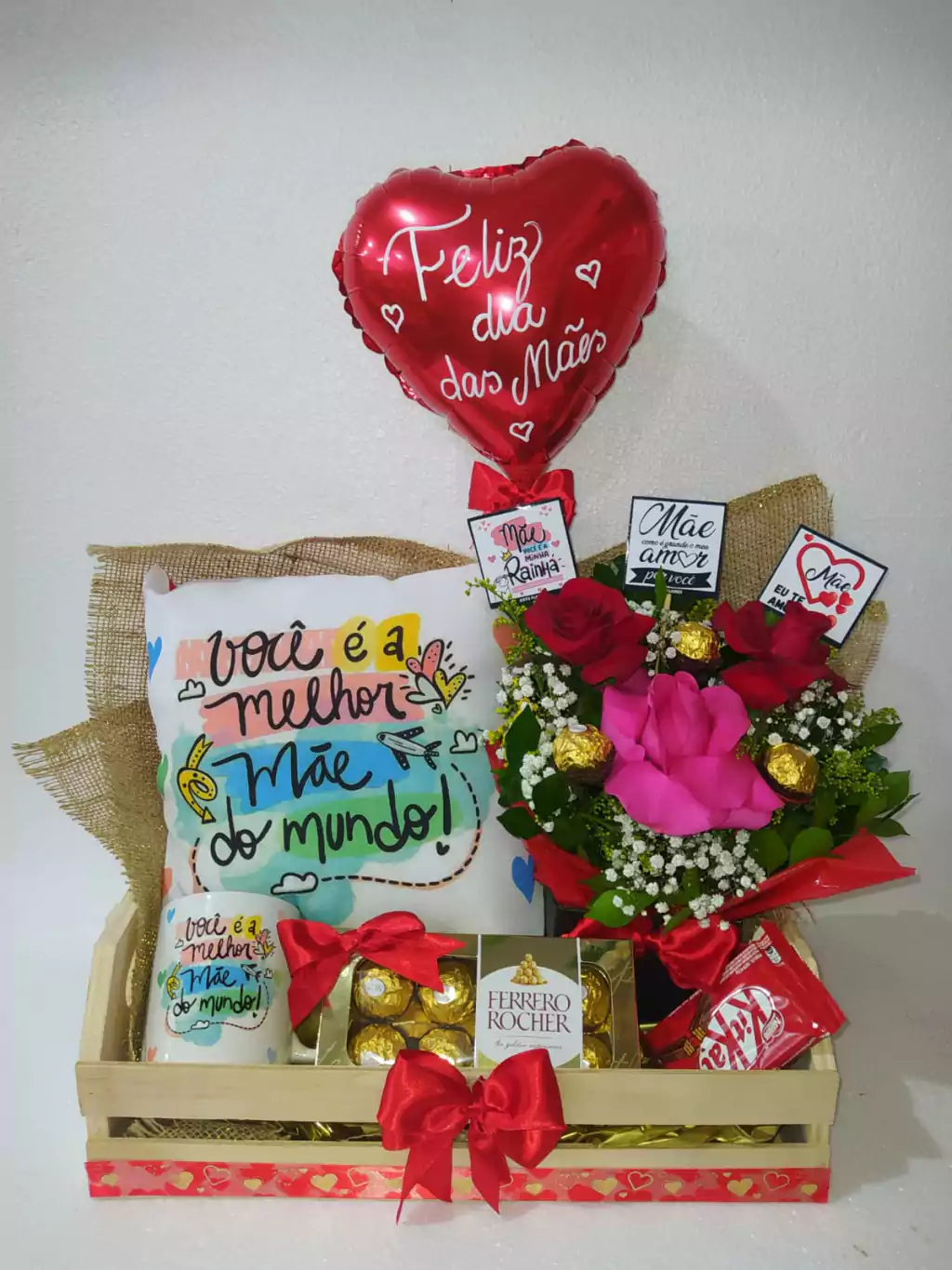 UMA ALMOFADA , UMA CANECA PORCELANA, 1 KIT KAT, ARRANJO COM 3 ROSASCOM 3 BOMBONS FERRERO, UMA CAIXA DE FERRERO COM 8 BOMBONS