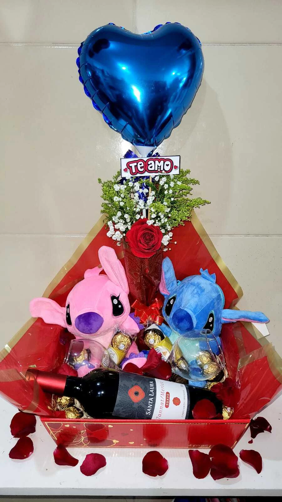 CESTA ROMÂNTICA( vai 2 ursos Stitch+ 1 vinho grande 750ml +2 taças + 2 pacotes de ferrero que cada um vai 3 unidades + 3 unidades alvo de ferrero dentro da cesta + 1 cone com uma rosa natural + 1 balão