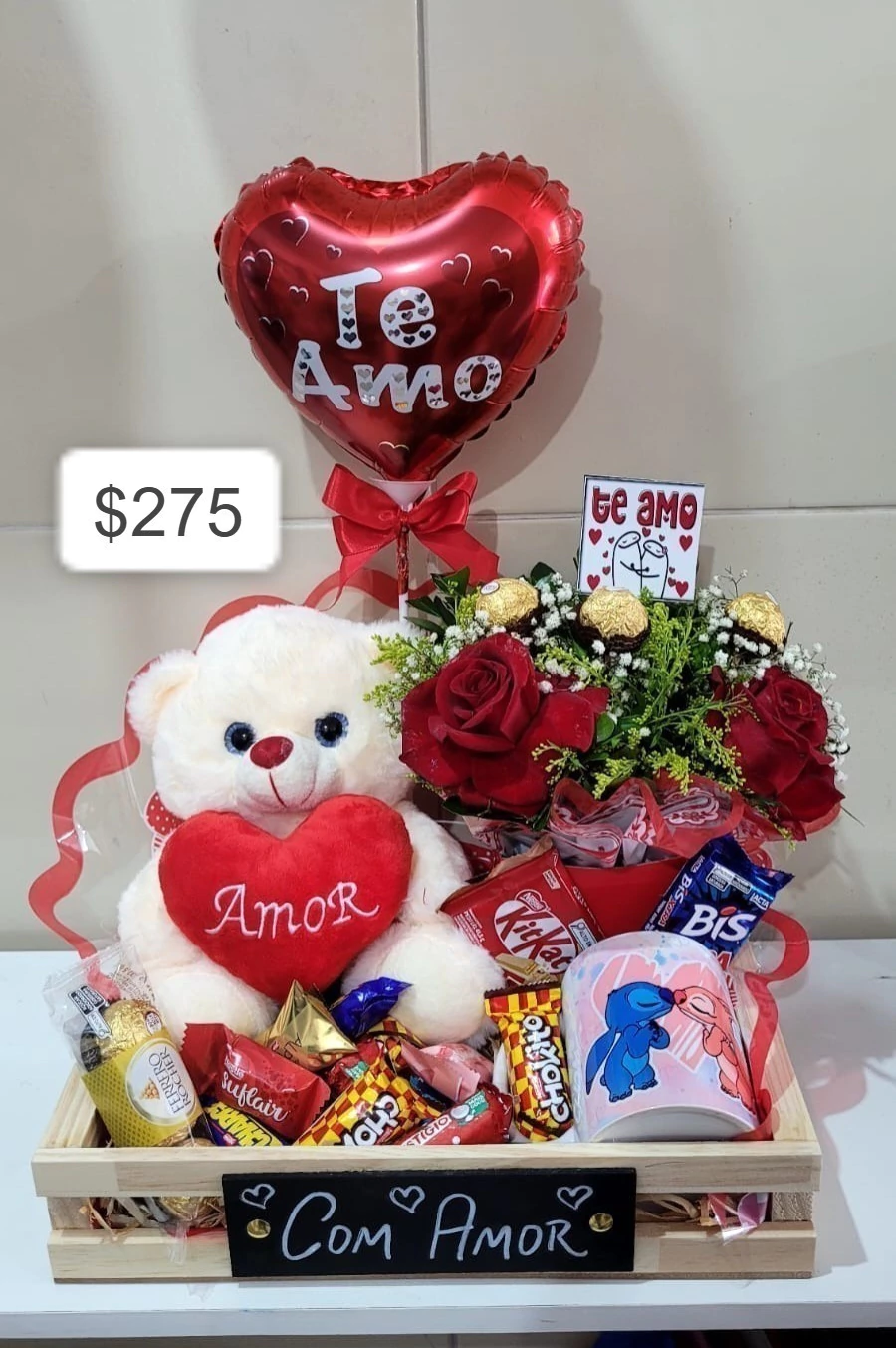 CESTA ROMÂNTICA(1 URSO +ARRANJO COM 2 ROSAS COM 3 UNIDADES DE FERRERO +1 PLACA +1 CANECA PERSONALIZADA DE AMOR + 1 PACOTE DE FERRERO COM 3 UNIDADES +.