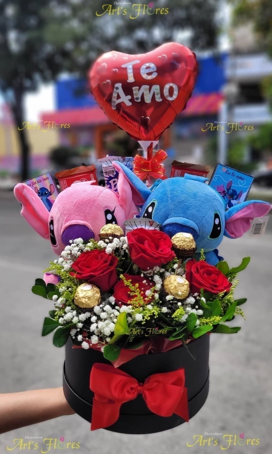 Combo ROMÂNTICO ( Caixa Box, 2 ursos Stitch,4 kiket OU BIS , 4 unidades de ferrero , 2 placas , 1 balão , arranjo natural com 4 rosas